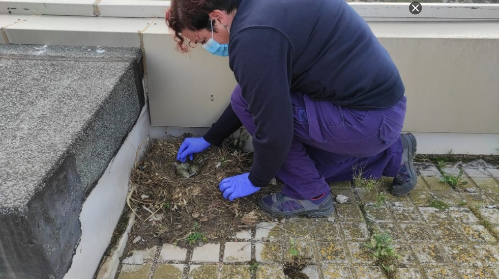 En la fotografía se aprecia cómo la técnico responsable de Belmonte Ambiental inspecciona un nido de gaviota.